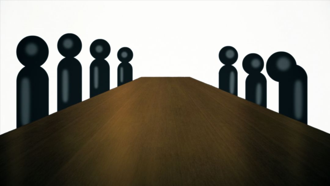 在《重返未来》第二章第二节中,阿尔卡纳(重塑之手)与维尔汀(基金会)坐在桌子上“平等对话”,斯奈德与勿忘我站在远处背景墙前,淡化成他者。他们无法说话,甚至无法被发现,或者说他们本就是背景墙的一部分