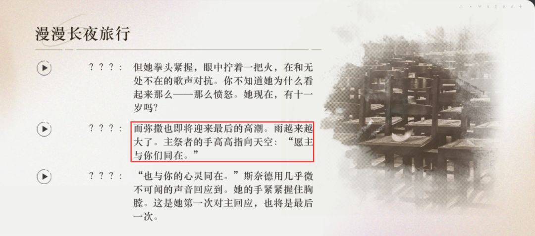- 现实中维尔汀中弹、流血→幻境中维尔汀从树上摔落、流血,引出魔精的话题