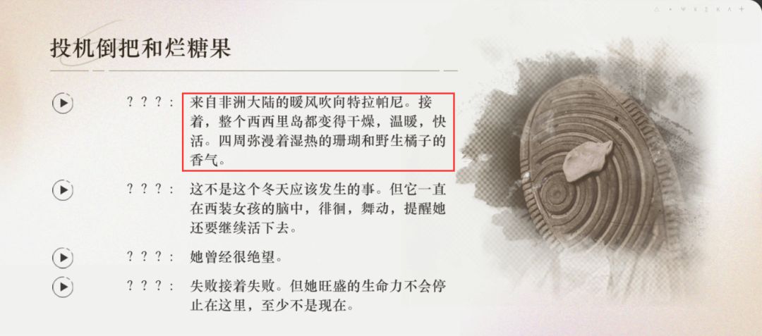 -幻境以“斯奈德在西西里橘子园的童年回忆”为蓝本,“偷橘子的家伙”将幻境与现实联系了起来(维尔汀手中的橘子让斯奈德以为对方偷了她家的橘子)-