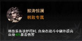 天赋1就直接给韩致增加了护盾效果,战斗开始和每隔10s都能刷出护盾,护盾持续3s,护盾根据攻击力生成,所以可以无脑怼攻击!