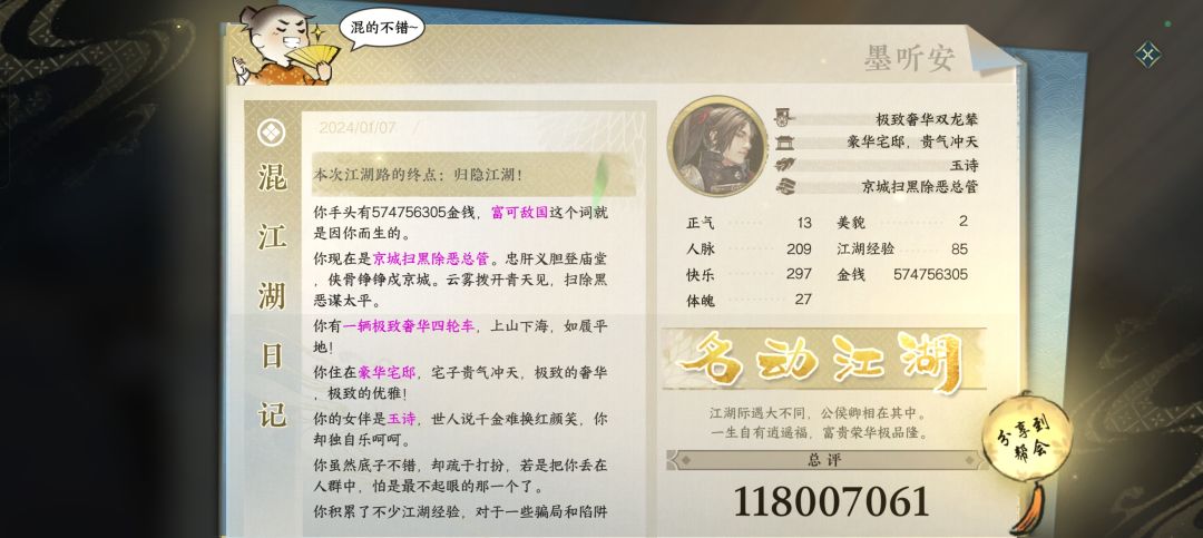 共7天时间,每天优先【碰运气】——【打麻将】抽取28W,另外每日日常涉及到钱的,一律保守选项,能不去就不去,但如果出现【扫阁】事件,一定点击【要】,有惊喜哦!