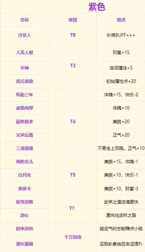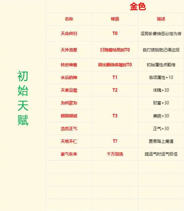 每次玩初始天赋可以根据自己需要进行刷新(新手5次,后期次数不限),其中不同天赋的效果也不同,通常来说金色>紫色>蓝色(不建议选),如果想要刷高分,建议主刷财富,次运气和