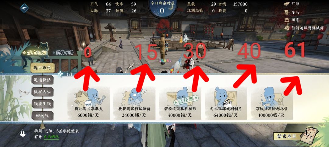 优先去【勾栏瓦肆听书看戏】,全刷人脉(最高61即可),之后去【混口饭吃】任职工作,这5种职业对应的人脉值分别是:0,15,30,40,61点,