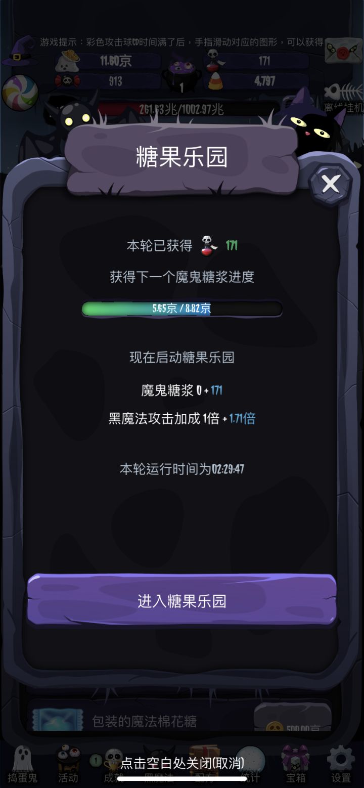 上面的左边第一个是你赚取的游戏币,左边第二个是糖果可以开宝箱,中间那个罐子代表你转生次数,右边第一个是魔鬼糖浆转生获取的魔鬼糖浆数量,第一个要1兆,第二个是升级装备的。