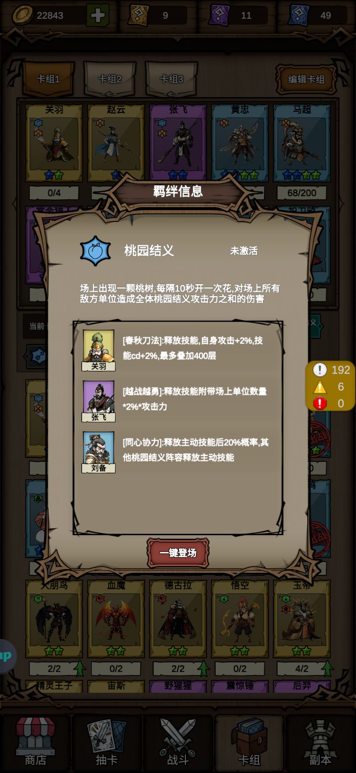 新手推荐阵容1:如图:财源滚滚(金蟾,财神,赏金猎人)搭配保证前波的银币收人,银币很重要(用来关卡升英雄最高5级)和开上阵位置,前面把这几个升满后保证银币在1万以上(上阵属性有个每回合加银币的%8最高888银币)一万多余的开位置,然后上阵如图:桃园结义和五虎上将。开完叠攻击。开完上阵位置银币还有一万多就可以卖掉财源滚滚3个英雄了。用桃园结义跟五虎上将刚好6个位置。