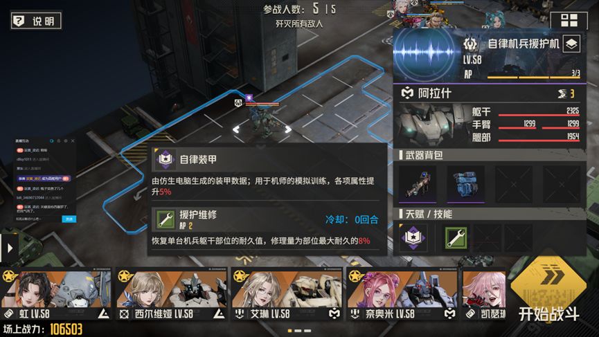 然后因为boss是泰坦类的,需要把所有部位都击破后才可以攻击核心,所以这里武器我们选择重伤最高的突击武器(重机枪、散弹枪、轻机枪)。角色自然也会让突击属性最高的突击手为主,具体可以按你的box自由搭配,也可以使用我的阵容,因为除洛莎外都是基础卡,没有洛莎也可以用玛丽代替。