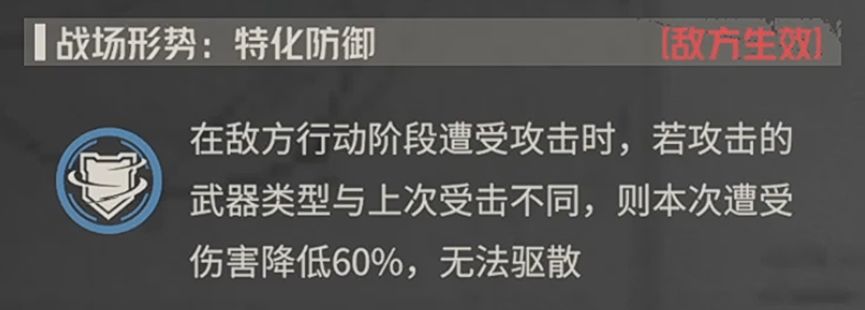 先来看看这次战术模拟的buff战场形势-如果在受到敌方(我方)行动时受到攻击时,如果攻击的武器类型不同则本次受到的伤害降低60%。这意味着在我方行动攻击时,必须所有人都使用同类武器,需要注意的是协力攻击也会算在内,所以即使是奶妈(工程)也请换同类武器。