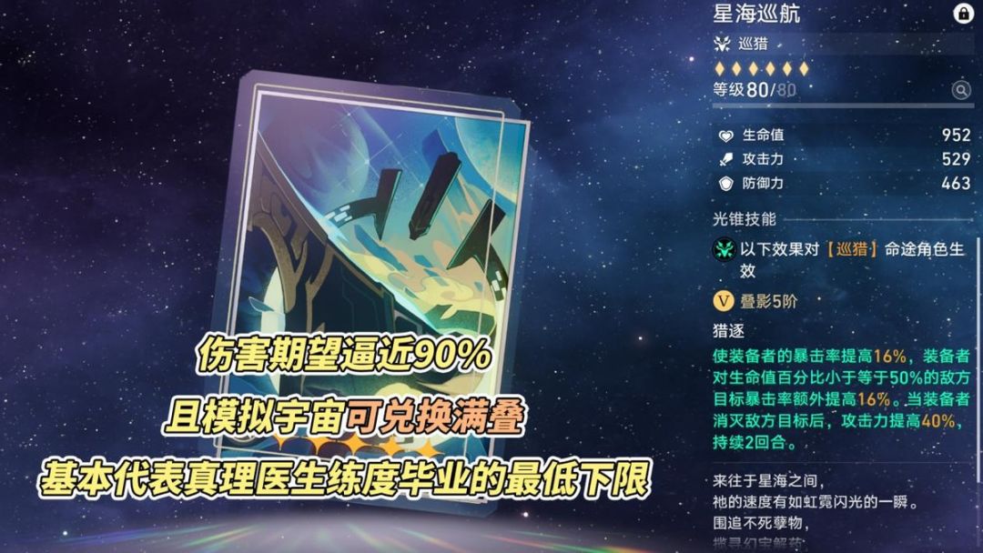 光锥特性【思想训练】触发难度:①基础20%暴击伤害。不似暴击率很容易导致部分角色暴击溢出,暴击伤害对巡猎角色皆有益;