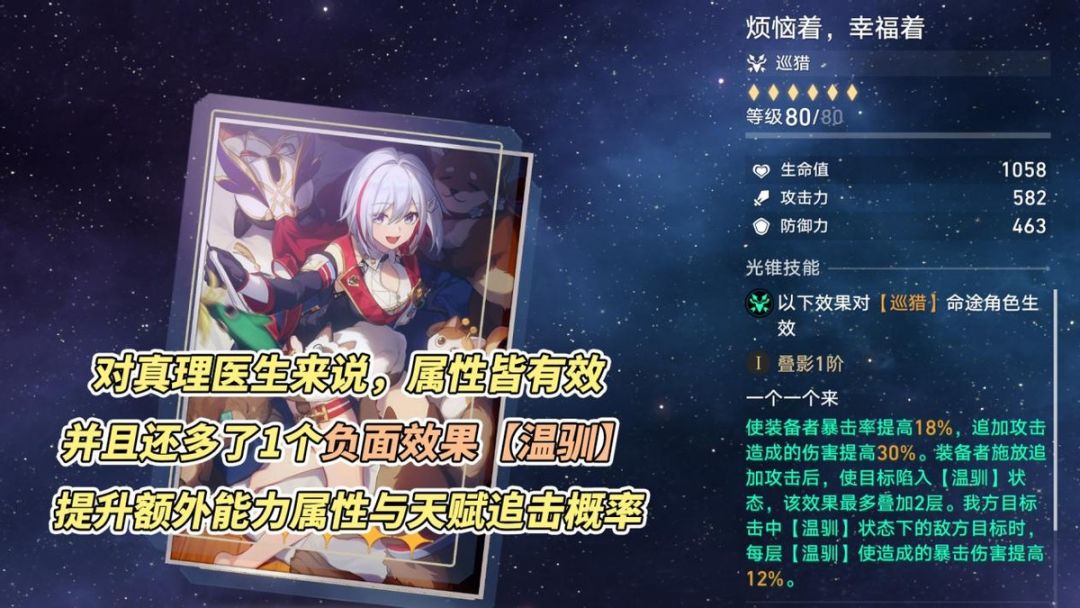 【伤害期望90%-100%】叠1「烦恼着,幸福着(托帕)」。托帕光锥除了全有效的属性外,还可为敌人附加负面状态【温驯】,可进一步提升真理医生的额外能力数值与天赋追加概率,太妙了!