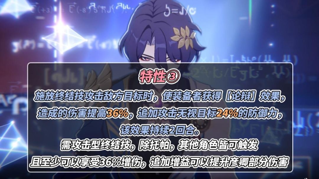 ③攻击型终结技可触发【辩论】,获得2回合的36%增伤+追击24%无视防御,除托帕其余巡猎皆可触发,其中增伤皆有益,至于追击增益对彦卿只有少量提升。