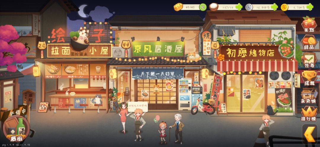 首先说一下画风,游戏属于日式风格,整体的背景是刚刚下班的傍晚,华灯初上,小木屋店铺透着温暖的暖黄色灯光,有《深夜食堂》的感觉。晚归白领,遛弯的老爷爷,玩耍的小孩子吵吵闹闹,一个接一个的走进店铺,你便开始卷寿司,煮拉面,倒米酒。治愈着客人的心也在治愈着自己。