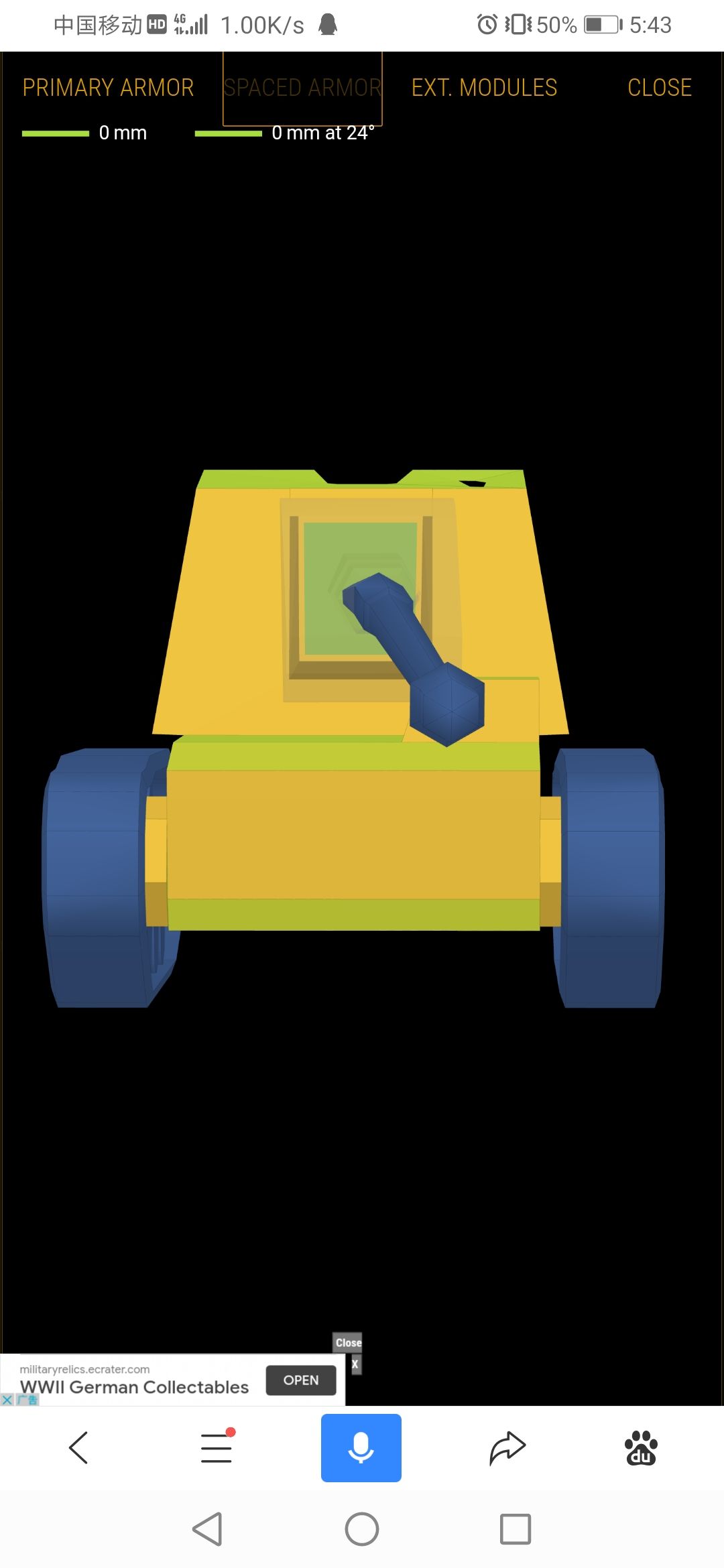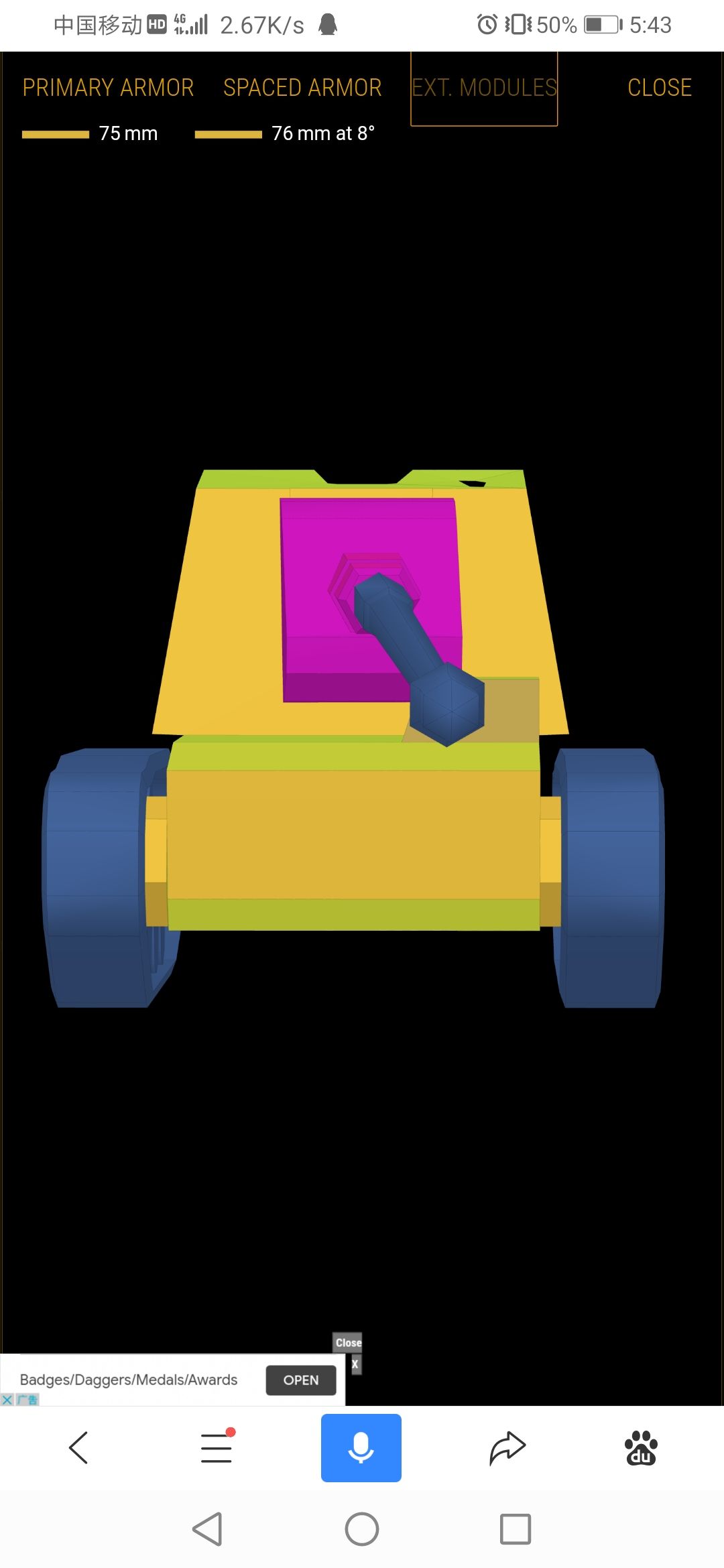 机动:埃米尔的机动性非常差,原因在于它是重坦底盘,机动性上本来就先天不足,极速25倒车12,实际功重比公路8.52/泥路7.21/水路4.46,实际转速公路39.27/泥路33.23/水路20.57,这个机动性还有什么好说的?也只能黑枪了,该挪位置的时候决不能犹豫,否则很可能跑不掉。