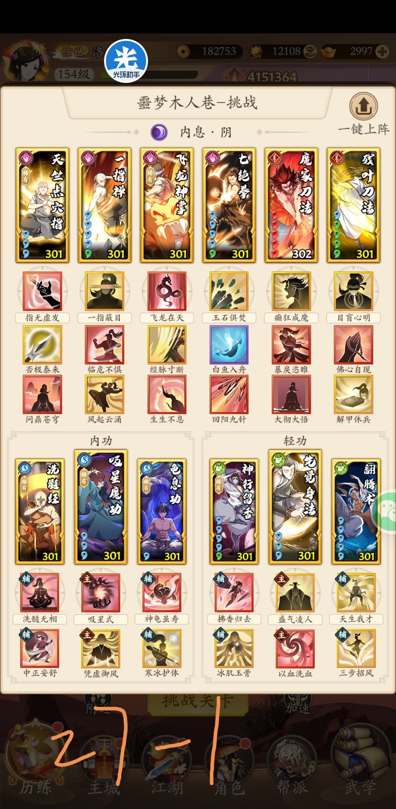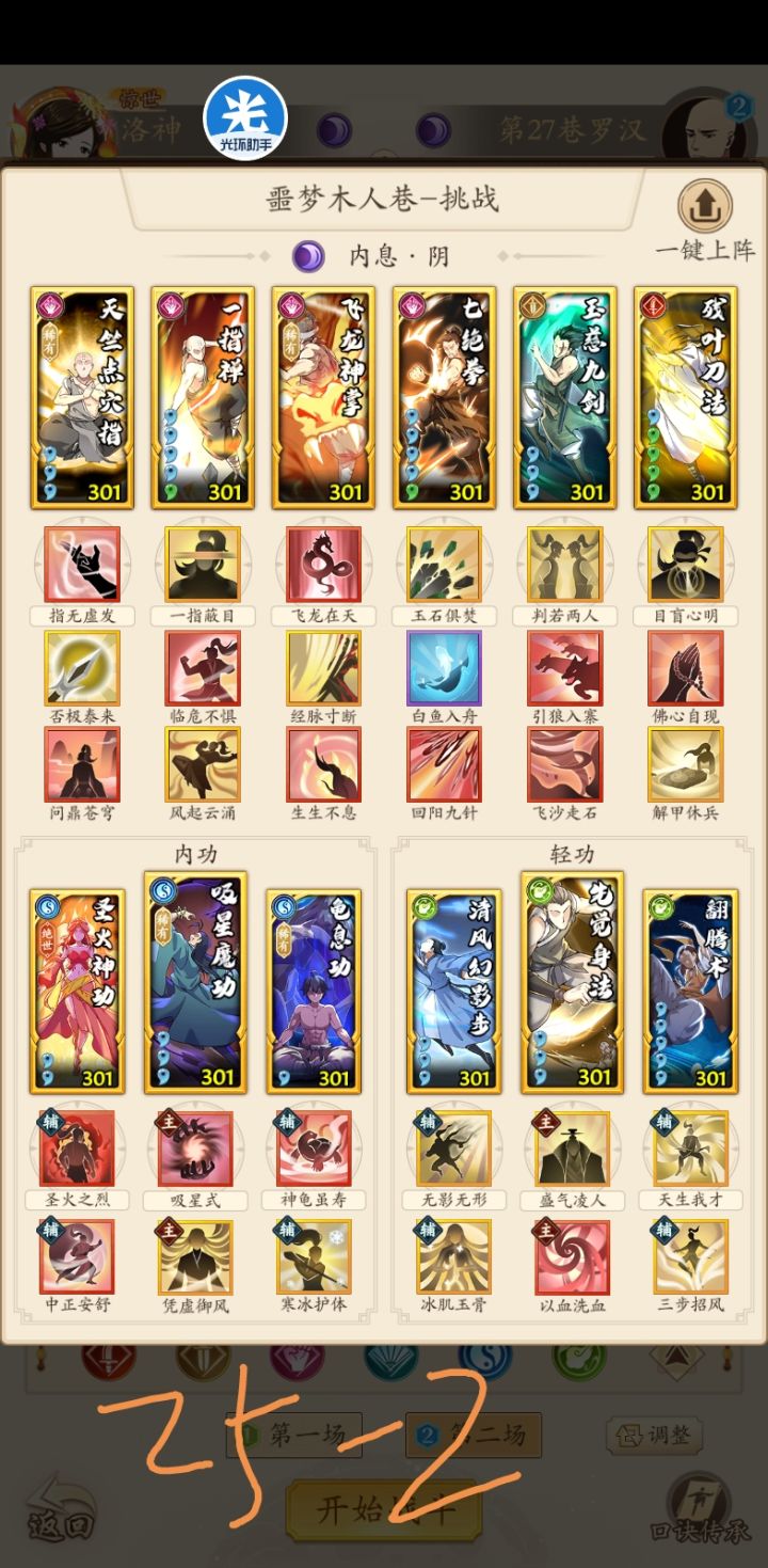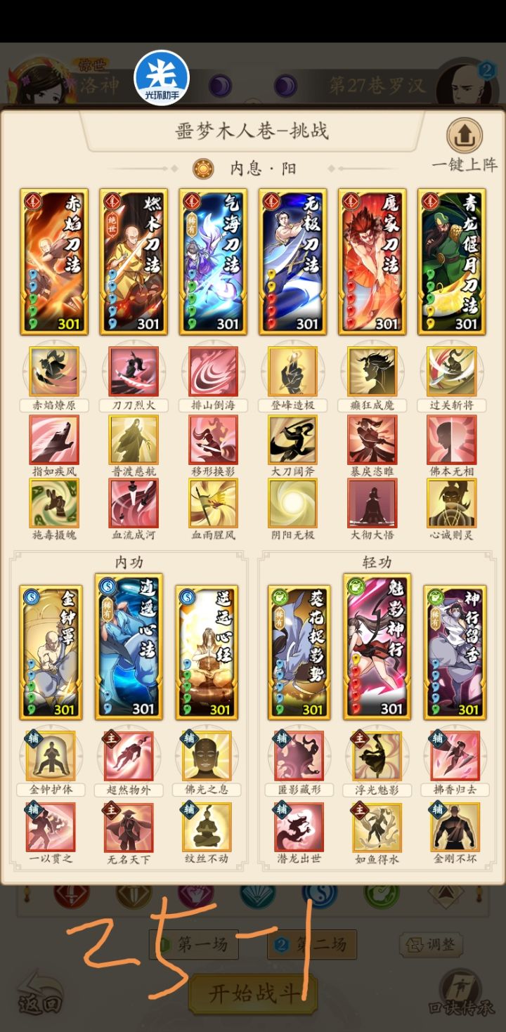 首先感谢这位朋友,指出了回阳九针在这个套路里没有起作用,建议大家把 回阳九针 的位置换成 普渡慈航。武学等级是301,301以下不确定能不能过。专门为25配的,25和26是一个套路,没有注意是不是26的好的配招。补充27和28的套路。请兄弟们拿走不谢。补充29层的,在tap搜其他大佬的套路,第一套吸内,第二套像是奇门那个,能过。