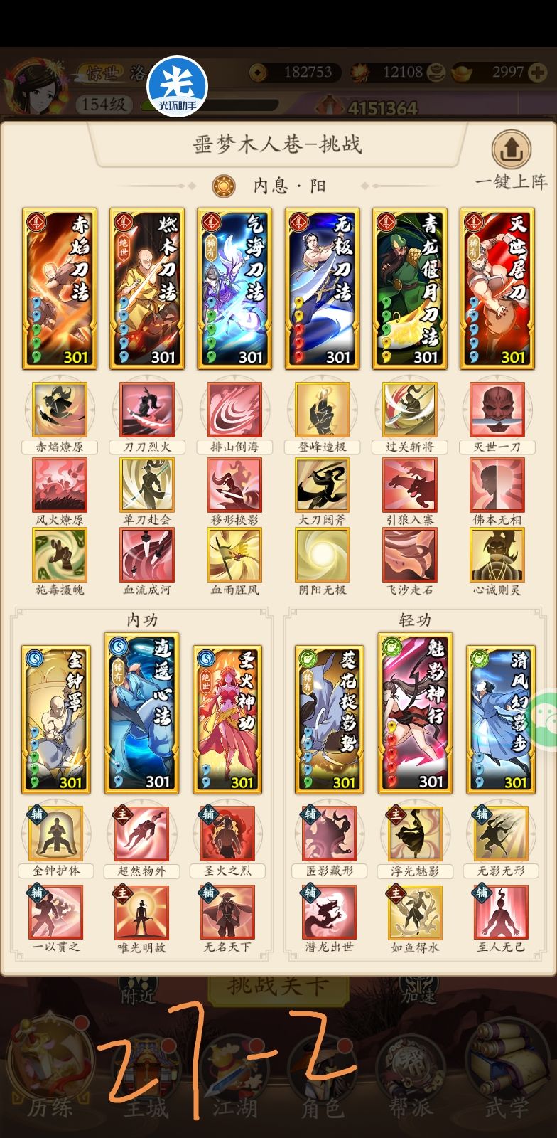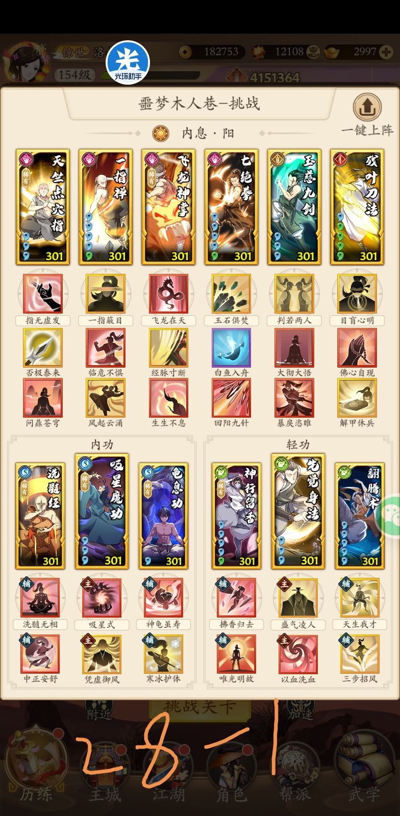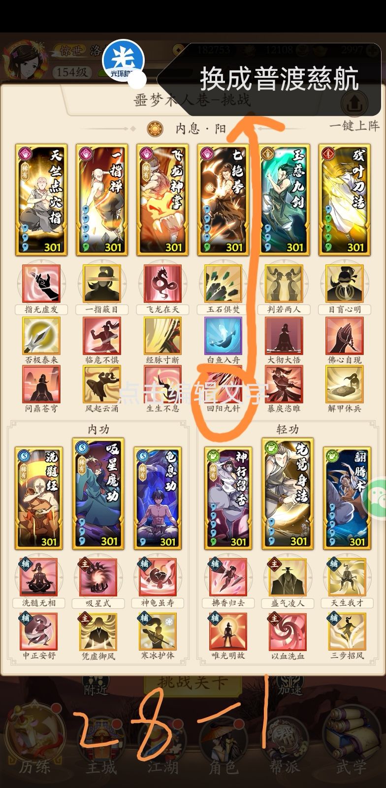 首先感谢这位朋友,指出了回阳九针在这个套路里没有起作用,建议大家把 回阳九针 的位置换成 普渡慈航。武学等级是301,301以下不确定能不能过。专门为25配的,25和26是一个套路,没有注意是不是26的好的配招。补充27和28的套路。请兄弟们拿走不谢。补充29层的,在tap搜其他大佬的套路,第一套吸内,第二套像是奇门那个,能过。
