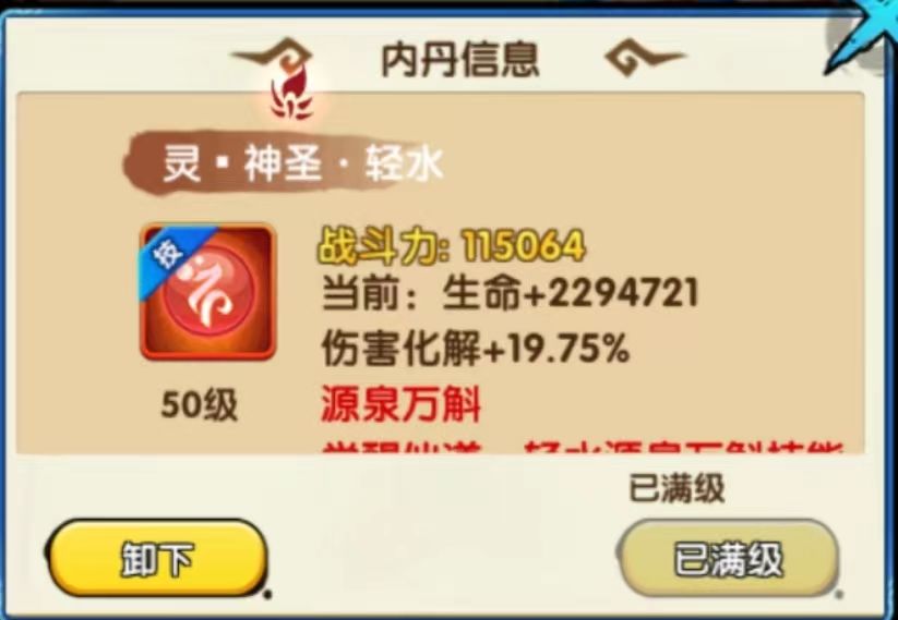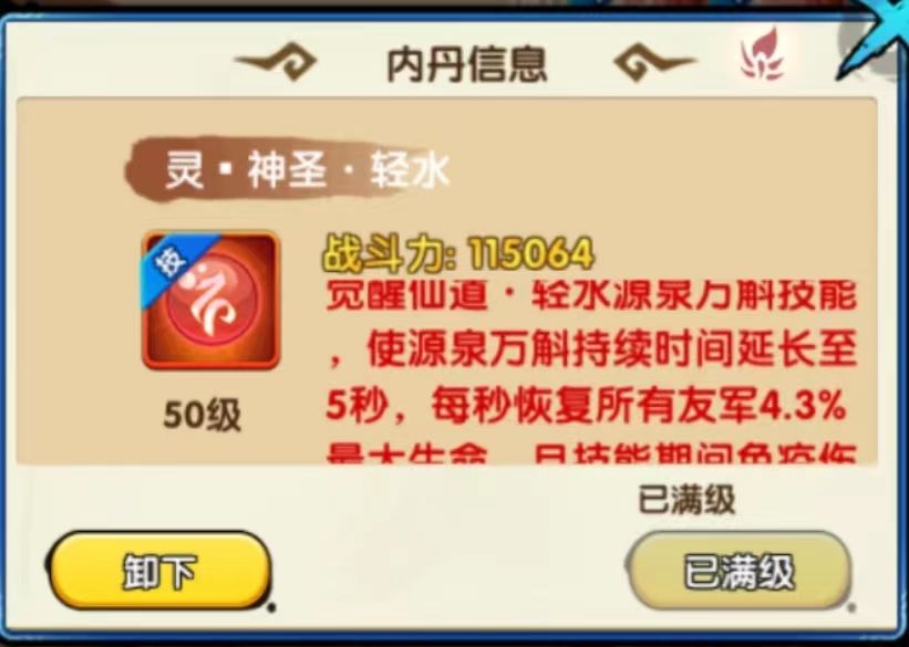 仙道轻水是橙宠轻水修真后成为红宠,拥有两颗专属内丹:灵.神圣.轻水、灵.觉醒.轻水。两颗专属内丹属性有差异,觉醒宠物技能相同,都是觉醒轻水源泉万斛技能。