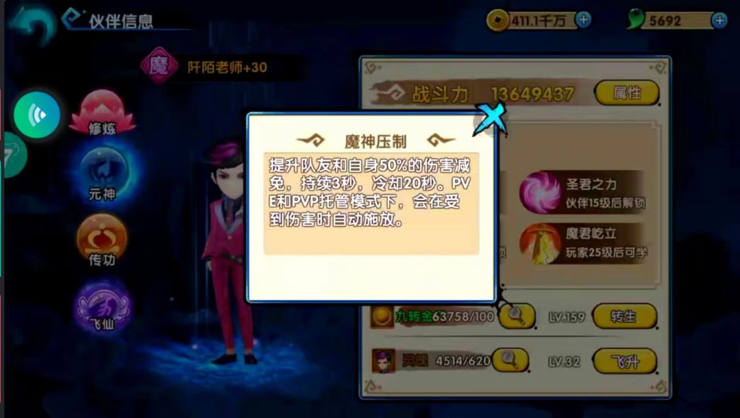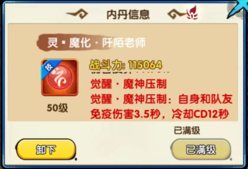 觉醒.阡陌老师魔神压制技能:自身和队友免疫伤害3.5秒,冷却CD12秒。