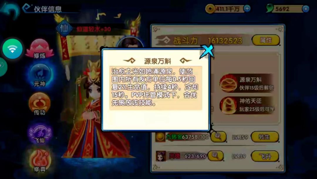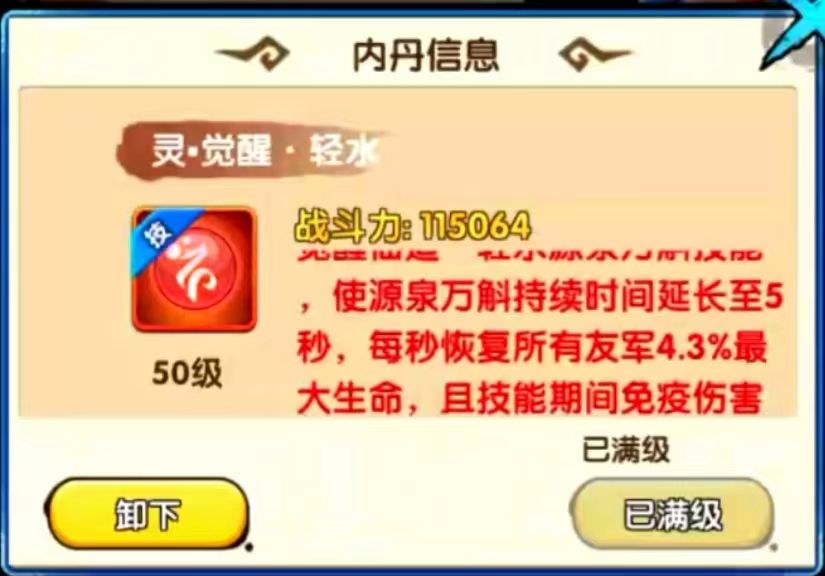 觉醒.仙道轻水源泉万斛技能:使源泉万斛持续时间延长至5秒,每秒恢复所有友军4.3%最大生命,且技能期间免疫伤害。
