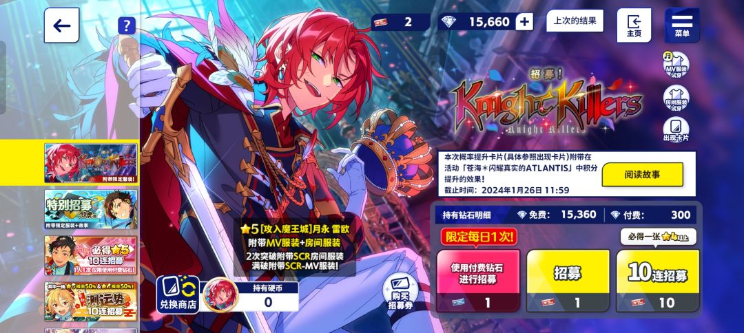 ),算起来好像也差不多投了10w钻在卡池里,现在就是一整个悔恨,宗老师我一定会攒回忆币把你带回家的,这次只能先冲个一卡了呜呜呜