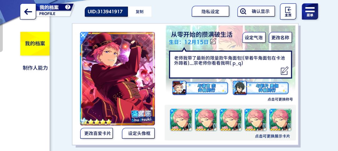 ),算起来好像也差不多投了10w钻在卡池里,现在就是一整个悔恨,宗老师我一定会攒回忆币把你带回家的,这次只能先冲个一卡了呜呜呜最后附上我现在的资源~好友摩多摩多