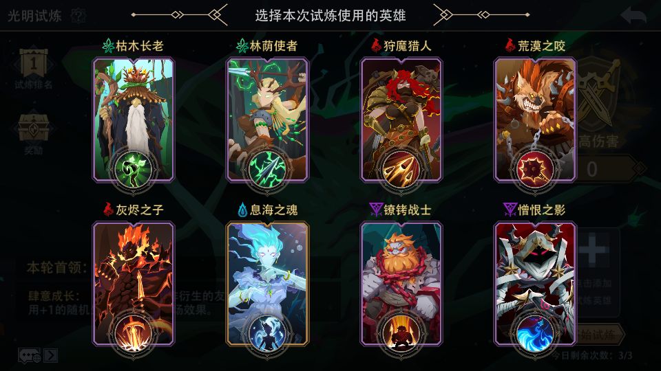 蘑菇补血流:(孢子+树妖+低语者+生命古树+治愈之风等)该常规打法一般可以拿满魔晶奖励,2000分伤害打满需要的条件较高。