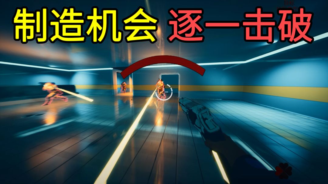 AI敌人的跟枪和定位非常快,不过,利用惯性冲刺 接两段位移 接子弹时间,还是能创造出短暂的timing,无伤消灭敌人的,破坏掉场景中的重要机关,再前往闪烁着白光的指定房间,即可通关。