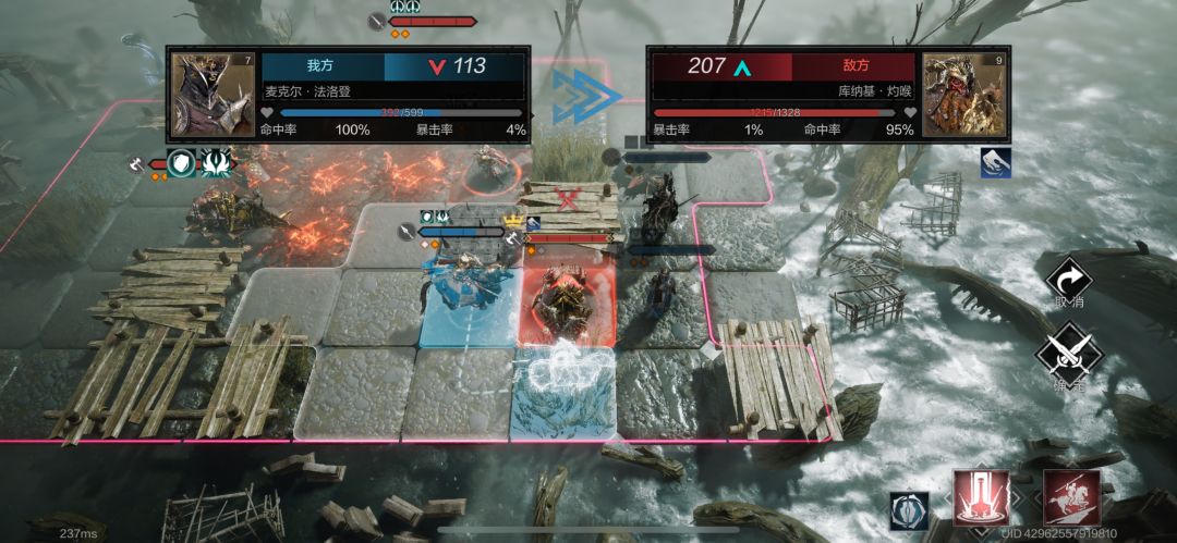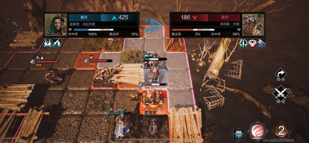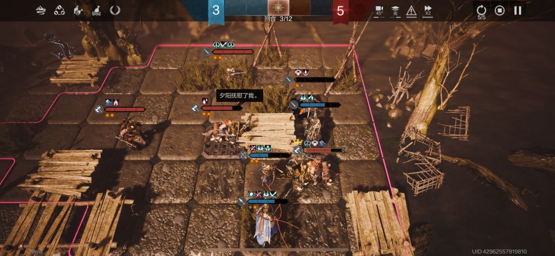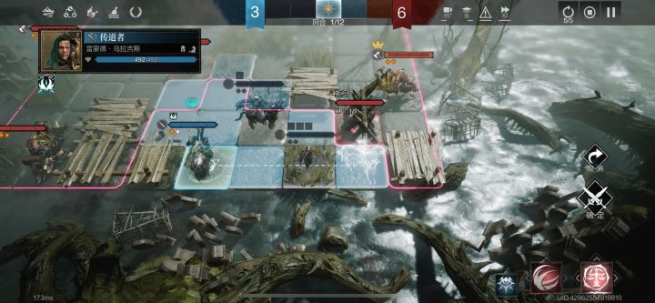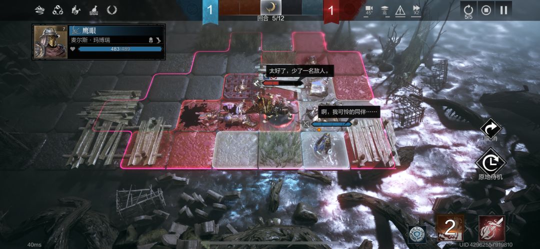 1️⃣第一回合先看一眼鹰眼身上有没有追随者Buff,主要是为了加血后面好过一点。开场后重骑和鹰眼各自右移一格,传道走到最右侧开二技能给队友上加血buff。