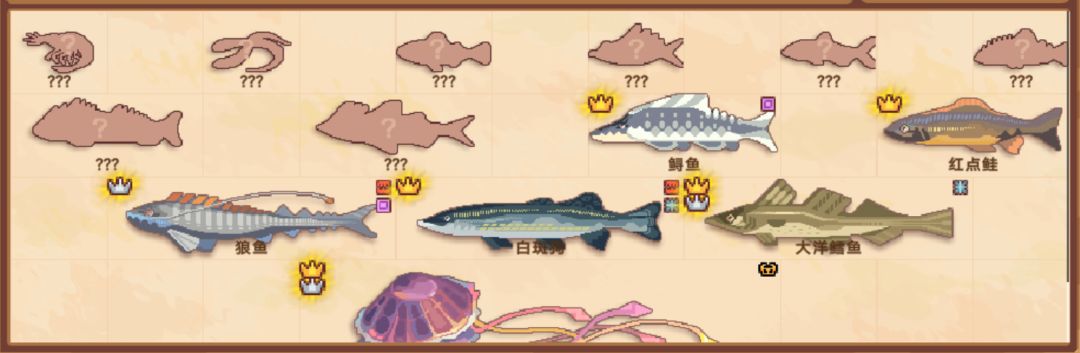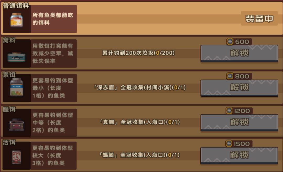 相较于其他两种渔具鱼饵解锁起来就缓慢得多了,除了窝料是钓到200次垃圾解锁,剩下的都要求某种生物金银冠全收集。但好处是可以在鱼竿可钓尺寸的基础上再叠加限制,可以更好得钓金银冠(推测,我也还没解锁)。