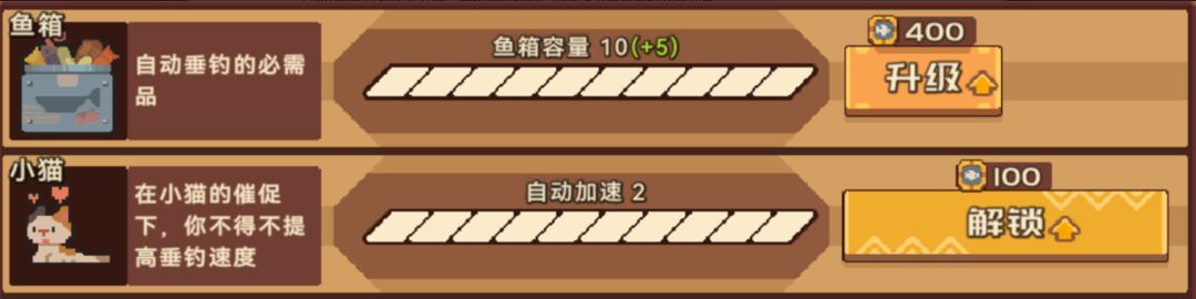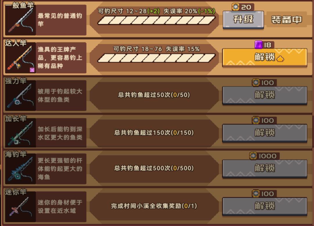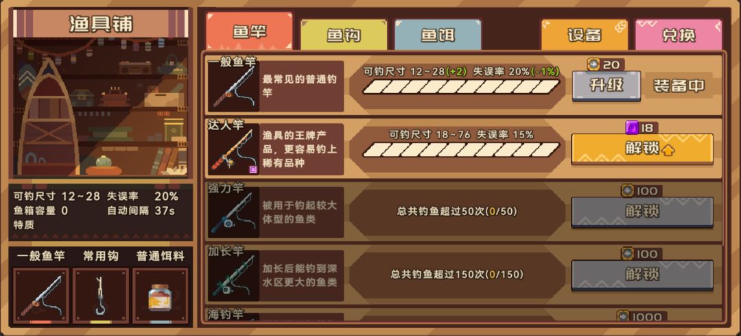 解锁、升级思路:宝石解锁的鱼竿可钓尺寸的范围跨度较大,很适合前期用来刷图鉴,前期先紧着一个鱼竿,但设备里的小猫和鱼箱可优先升级,直接影响效率(解锁应该都是100鱼币),鱼竿基本不用升满,按需,基本中间几级就可以,后期则按照自己的需求升级、解锁对应渔具。