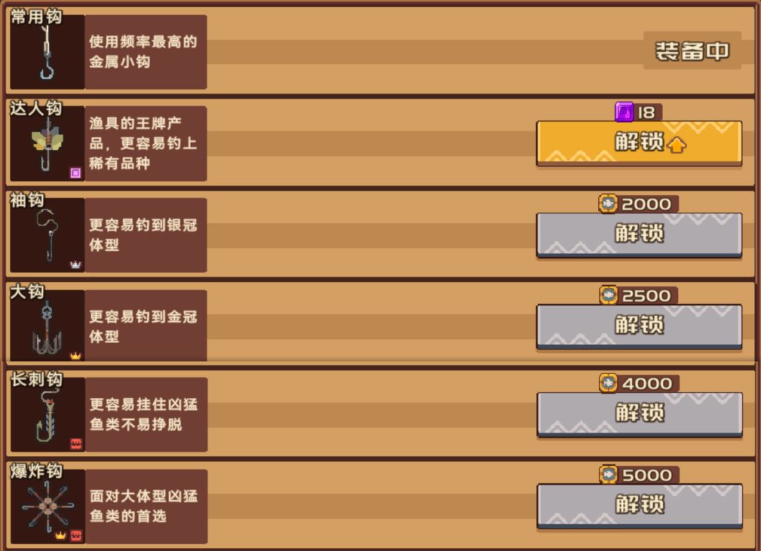 鱼钩的属性就直接很多,不同的鱼钩对带有某些特质的生物有加成。如稀有、金冠、银冠、凶猛。