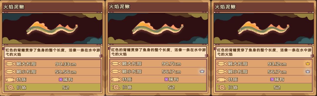 A:在满足可钓尺寸的情况下,钓到不同鱼的概率应该是差不多的(猜测,这个无从考究),除了带有某些特质的,概率应该会根据当前渔具的特质匹配度而增减。所以想要集中钓某一条或几条的金冠银冠时,首先要做的是要找到符合目标尺寸且可钓尺寸跨度尽可能小的鱼竿。如上面关于火焰泥鳅的图,想要钓火焰泥鳅的金冠,根据前两张图鉴页可知,要想获得火焰泥鳅的金冠,目标尺寸大概要在91或以上,我最后选择了如下的渔具。