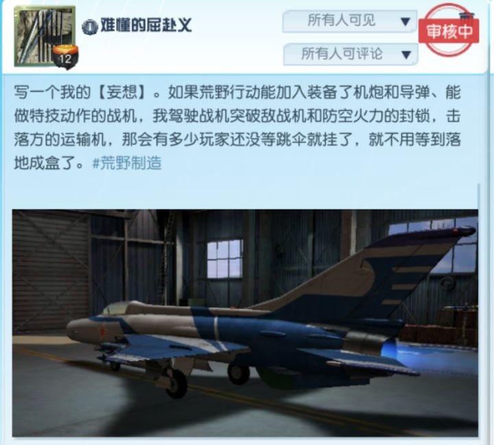 如果荒野行动加入装备了机炮和导弹、能做特技动作的战斗机,允许拦截敌方运送兵员的大型运输机、运输型直升机,那会有多少玩家在空中挂了,免去了落地成盒。图中的战机图片是我在现代空战3D中已经拥有的上了涂装的 #歼7 战机。
