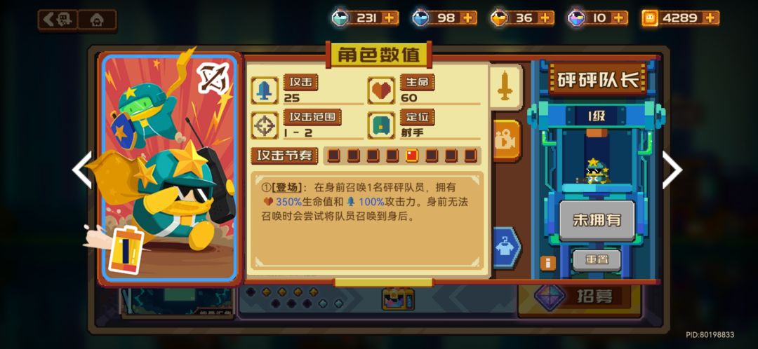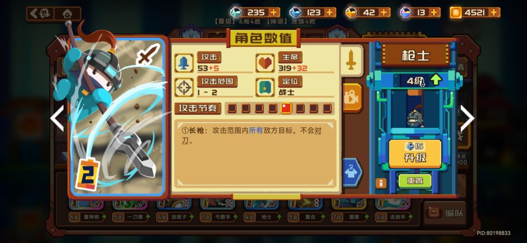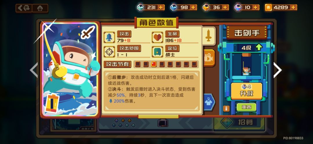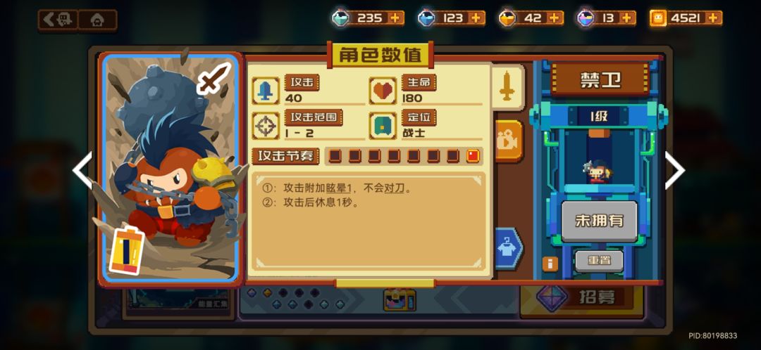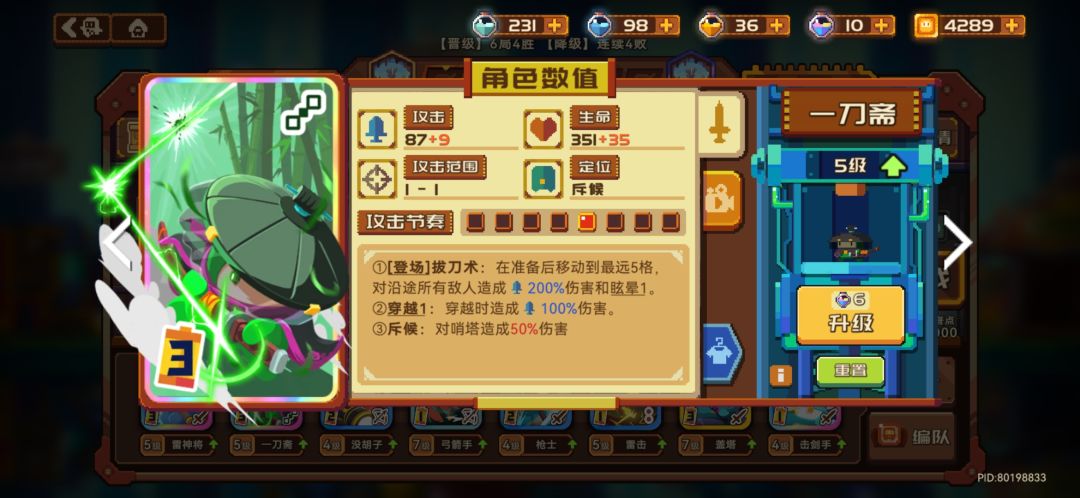 使用建议:数值非常美丽,200的倍率加上1眩晕再加上五格的穿越配上顶尖的攻击面板几乎能一刀把对手刚刚堆出来的队伍拆个七七八八,然后还能继续过人收过路费,并且还有穿越特效自带的无敌帧保护。无论前期进攻拆塔和中后期解场蹭塔都是非常舒适的单卡。为什么同样是稳赚的卡雷子哥是推荐他是必抓?因为一刀斋有能力前期主动进攻,JJC的套牌还是多少会有缺陷,进攻能力够强在前几个回合内结束战斗是非常正常的。