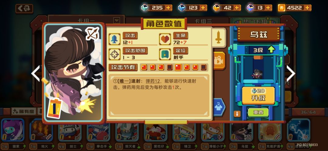 使用建议:作为你游稀有度最高的远程单位,机枪手没有获得任何在生存能力上的优待,他和绝大部分远程一样,是一个一碰就倒的玻璃人,想要依靠他拿下胜场,一定要记住观察对手的解牌使用情况,如果疏于观察,机枪手很容易就会沦为对手的赚节奏工具,雷神将下场打个雷、黄电电一下,诸如各种低费切后排手段都能把机枪手轻松处理掉,但是机枪手是有单刷盖塔以及他带领的一整只队伍的能力的,是有迅速拆塔结束战斗的能力的。他可以说是一把极为锋利的双刃剑,想要用好他,永远记得不要急,以防守为进攻。