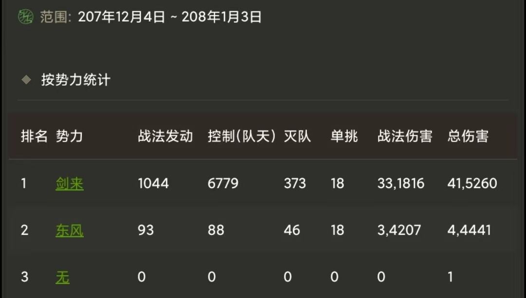 初几日,双方平手,后面差距越来越大,东风损失开始增加,伤亡已经到了18万:30万,此时又逢系统出错,剑来与东风皆对部队失去大部分控住力,这时候东风主力出现了战死至一兵一卒也不后退的惨烈场景,最后东风绝大部分军队人数显示为零,原地溃散。最后东风及春秋共损失近五十万军队,东风紧急退往老家齐国。