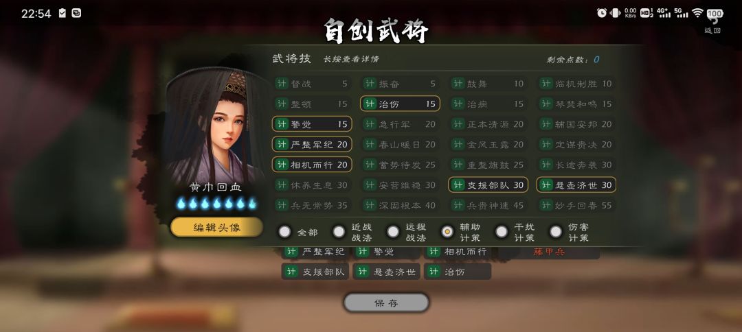 (1)“琴瑟和鸣”;(3旬,1.5蓝)单体技,解控,加18士气(没啥用,扎营永远满士气120点);