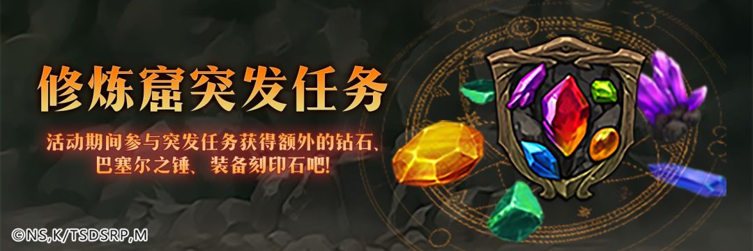 活动介绍:活动期间,通关修炼窟第1、3、5、7轮时,将会随机出现突发任务或活动BUFF其中突发任务可以获得钻石、巴塞尔之锤、装备刻印石中的1项,活动BUFF可以享受金宝箱获得概率翻倍或行动力减少50%中的1项!
