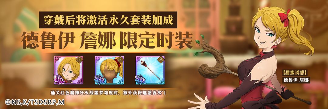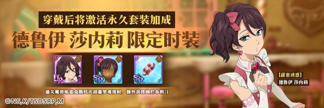 活动介绍:【甜蜜诱惑】主题头饰、武器时装限时开放售卖,穿戴指定时装组合出战,通关指定歼灭战时,可额外获得时装强化材料!