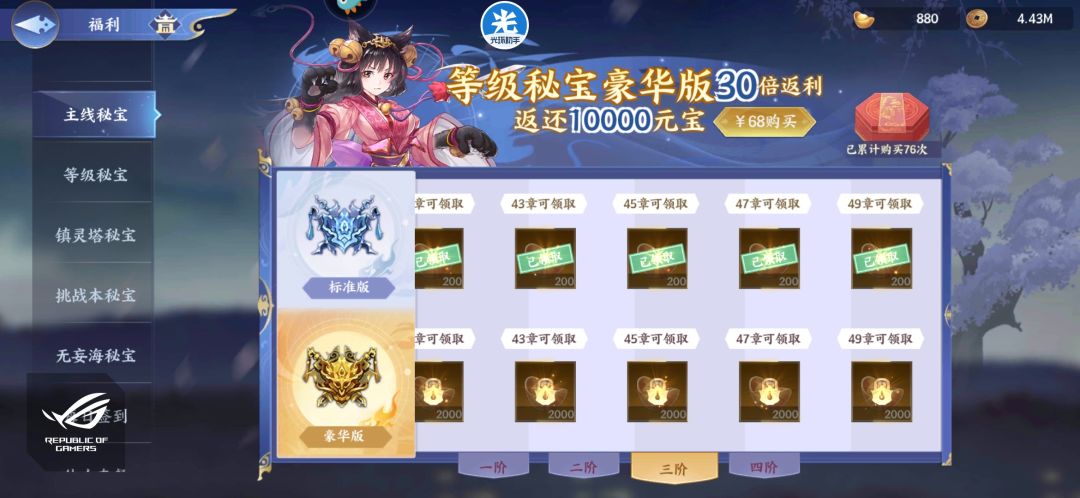 一个68爬塔 主线 等级各种,解一个68只能解一层,满满的氪金,画质不行就算,还升星玉限周购,注意绕坑,玩过这么久卡牌,不是不让你们回本,但这吃相难看,哪里都需要元宝,行会的元宝还要周一才领