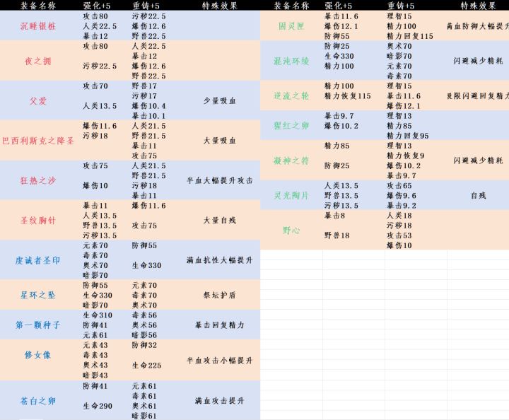 为方便查询,把自己需要的部分装备属性合在了一图,新入坑的小伙伴有需要可查看原贴,老登们应该自己都能记住了吧