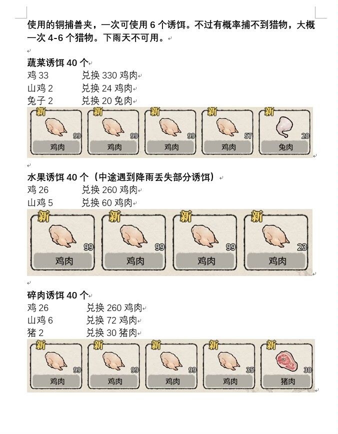 总的来说前期使用捕兽夹还行,三种诱饵152-215不等。一个诱饵捕捉价值最低的鸡可以换10个鸡肉,相当于600。