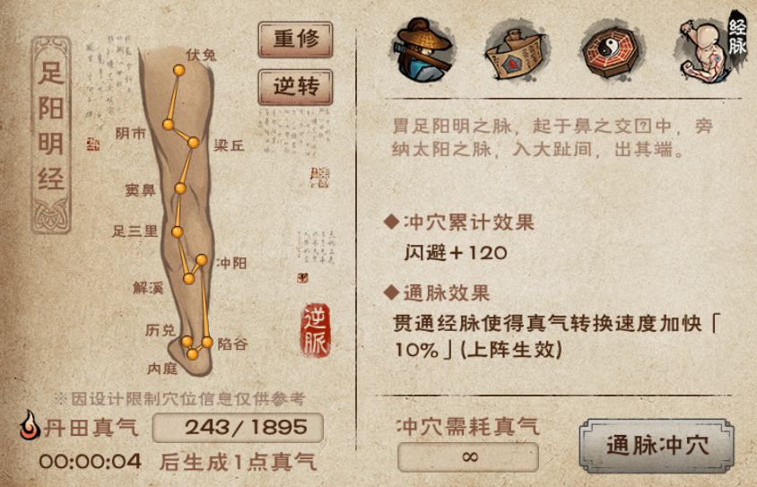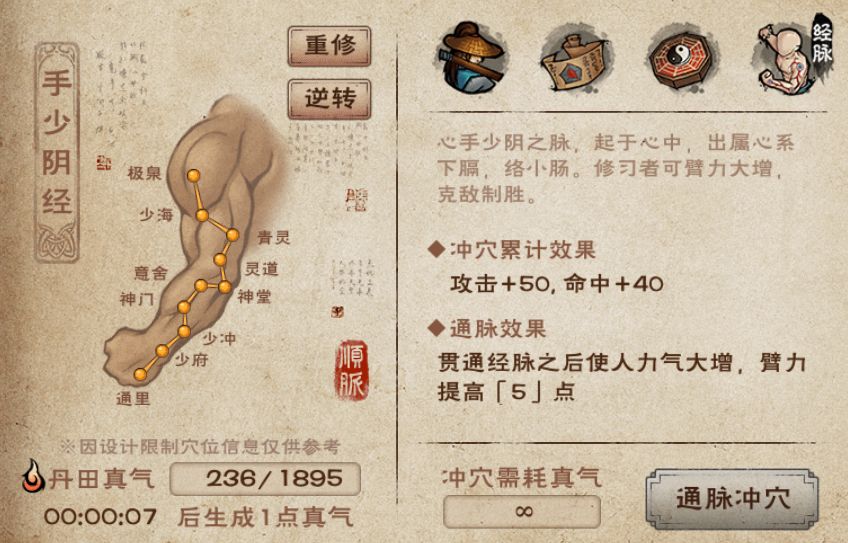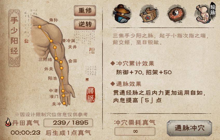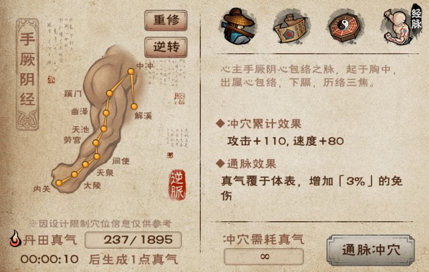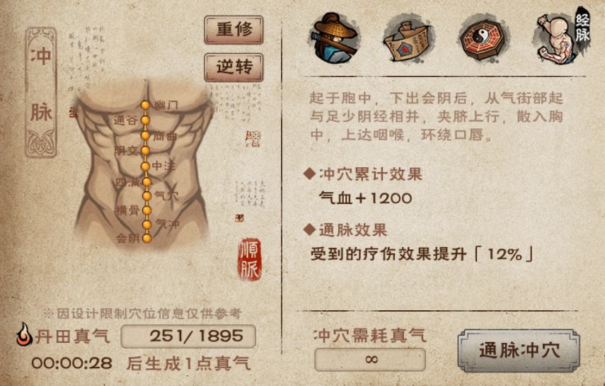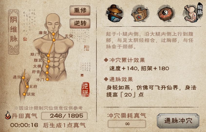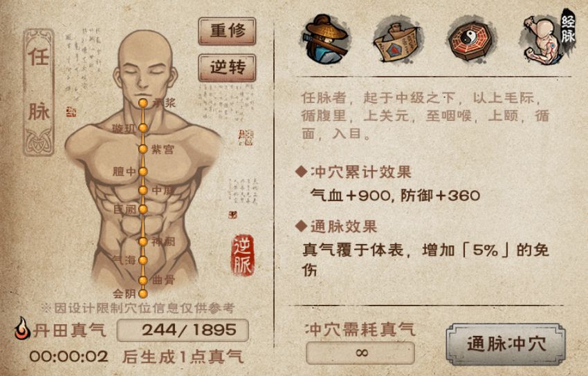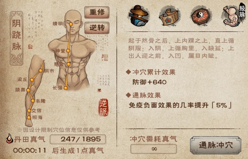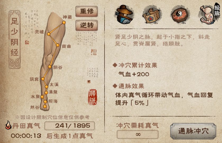 - 重修经脉:重修之后可以重新选择顺通或者逆通,但是不会返还已经消耗的真气,因此经脉重修后,大侠得重新用真气冲穴)