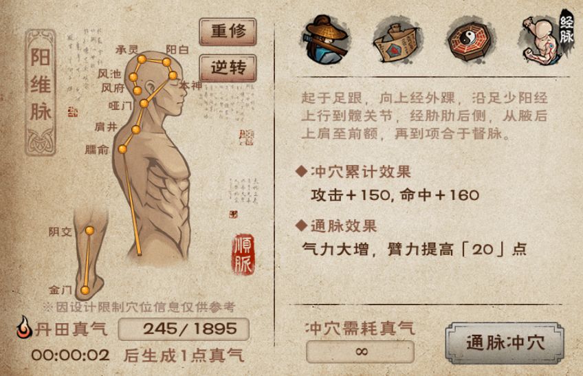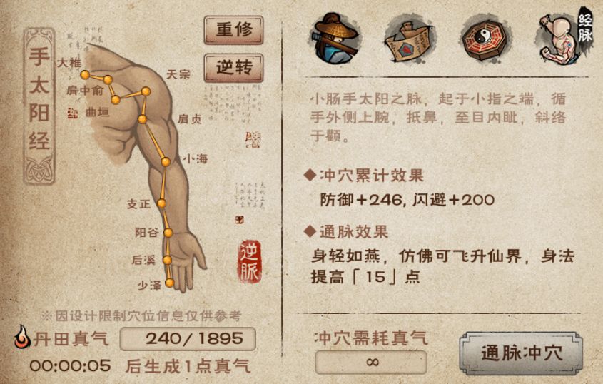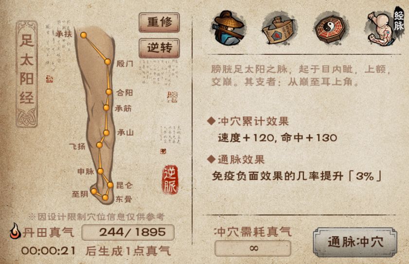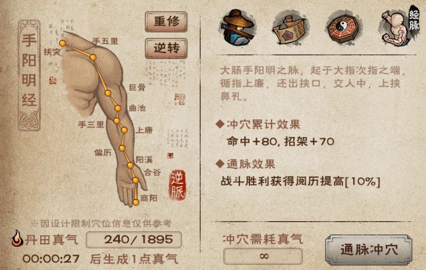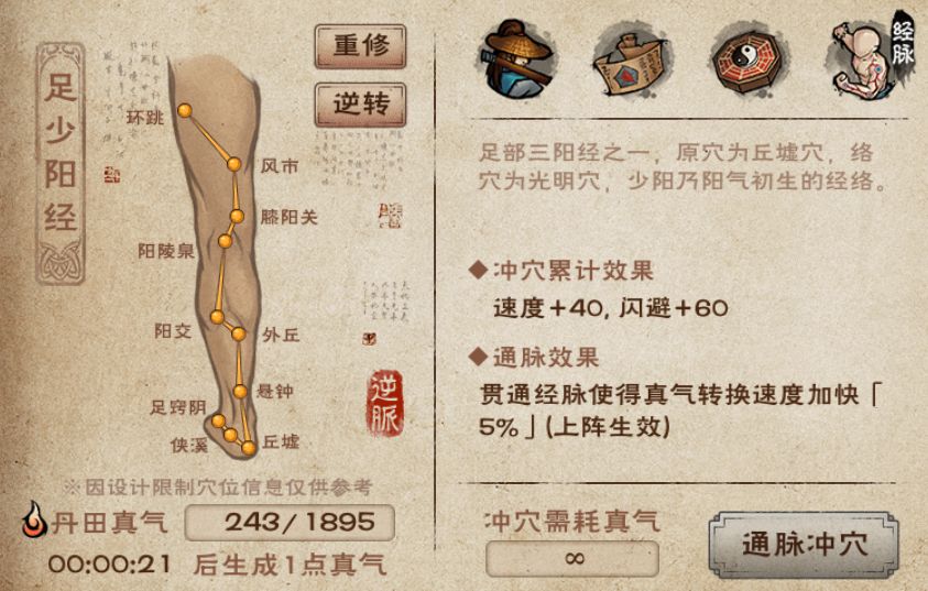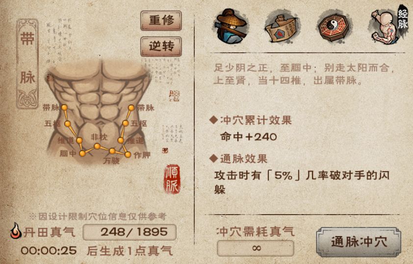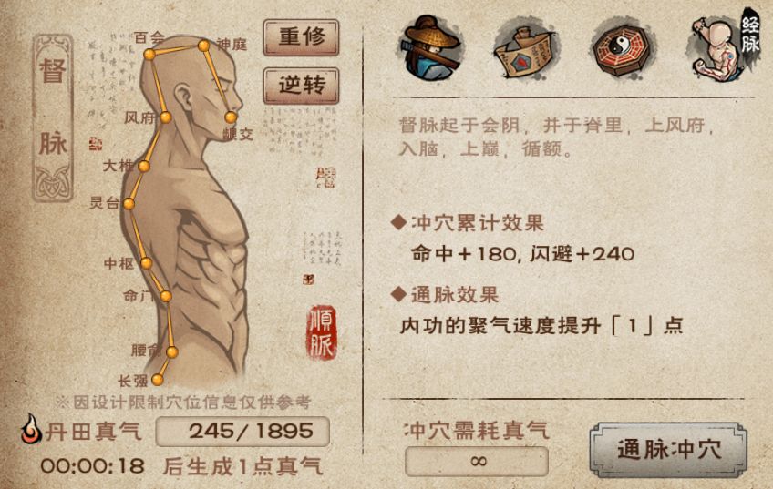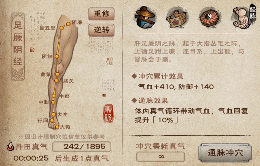 - 重修经脉:重修之后可以重新选择顺通或者逆通,但是不会返还已经消耗的真气,因此经脉重修后,大侠得重新用真气冲穴)