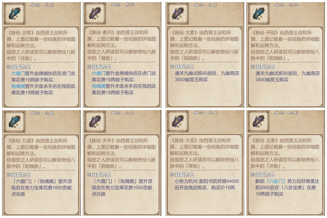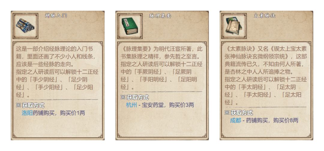 - 购买经脉书直接开启经脉:大侠们可以分别在:洛阳,杭州,成都这三个地方中的药铺购买经脉书从而开启我们的十二正经(见下图一),奇经八脉经脉书则分别在:势力,小势力,九幽商店,这三个地方出售(见下图二)。