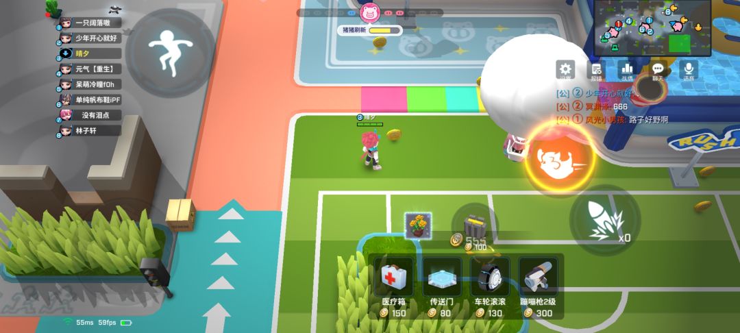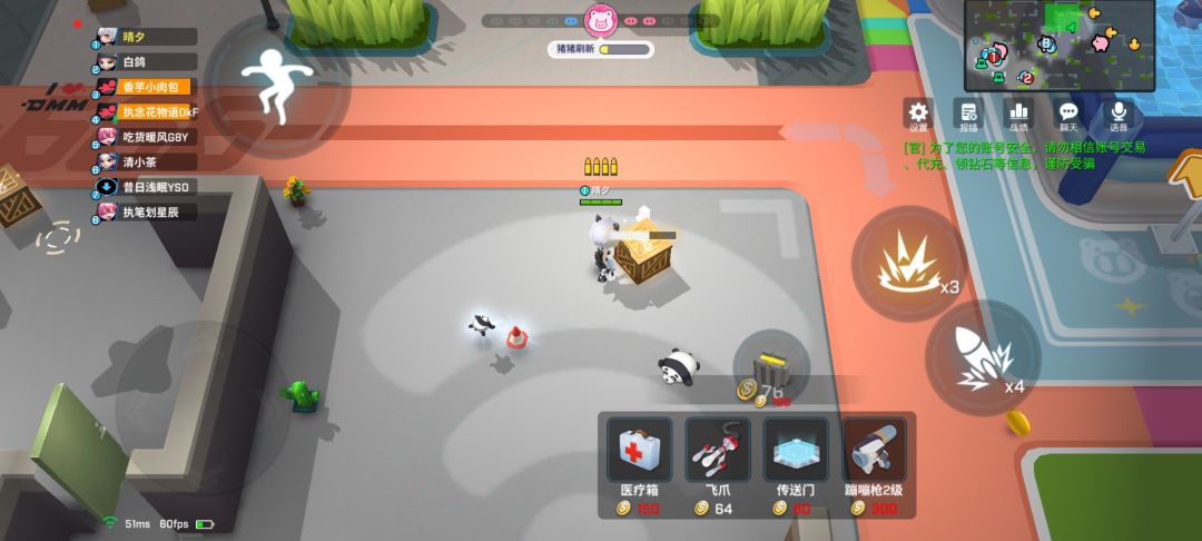 ⑤游戏流程:开局双方会有空投补给箱发放,分为金币补给(黄色)和道具卡补给;地图随机出现2只/3只猪。屏幕上方有猪猪刷新的时间倒计时,可以提前蹲点,当第一轮猪/运送2只猪全部运出去时(具体不清楚,后续补充),会有空投,地图绿色区域为金币补给箱子,同时还会有飞猪热气球撒金币。猪猪刷新时间到,会随机刷新3只/2只猪,当对方运走第4只猪之后,地图内会有空投补给。一方率先运走5只猪,游戏结束。