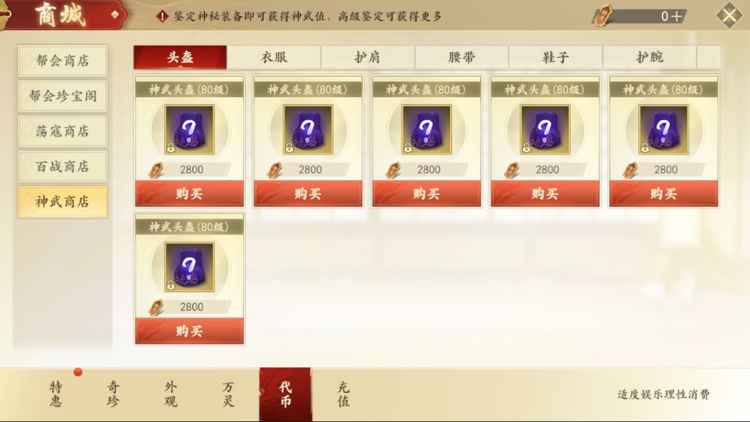 1、神武值:现在少侠鉴定神秘装备会获得神武值,使用神鉴符鉴定将获得更多神武值。