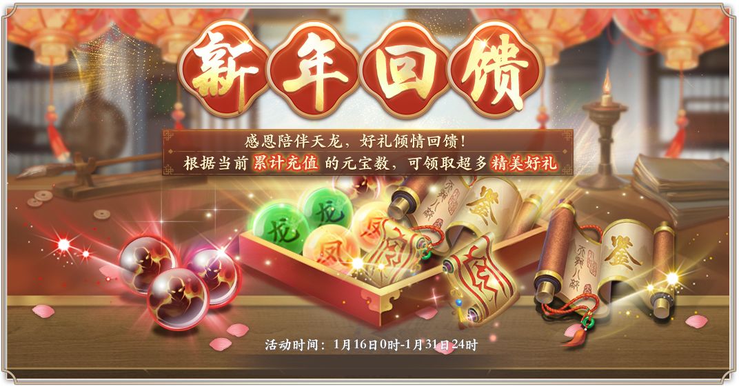 5)参与方式:活动开启期间,少侠可在新年回馈活动界面,根据累计充值的元宝数量,免费领取对应阶段的奖励,其中包含“红色品质内丹”、“神鉴符自选宝箱”、“混元龙玉”等各种惊喜好礼,千万不要错过。