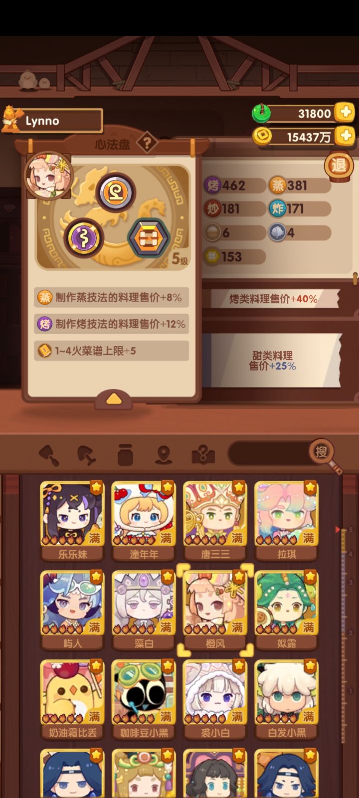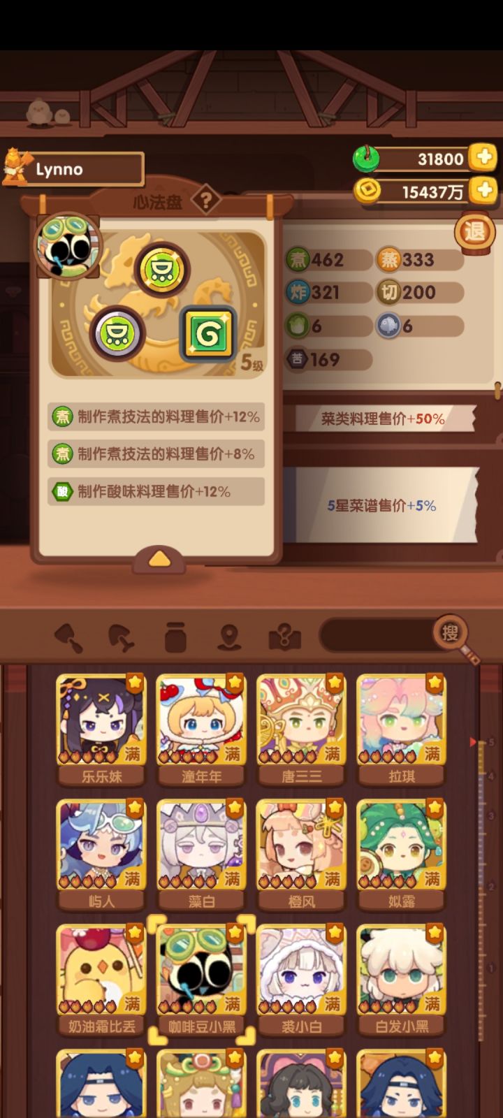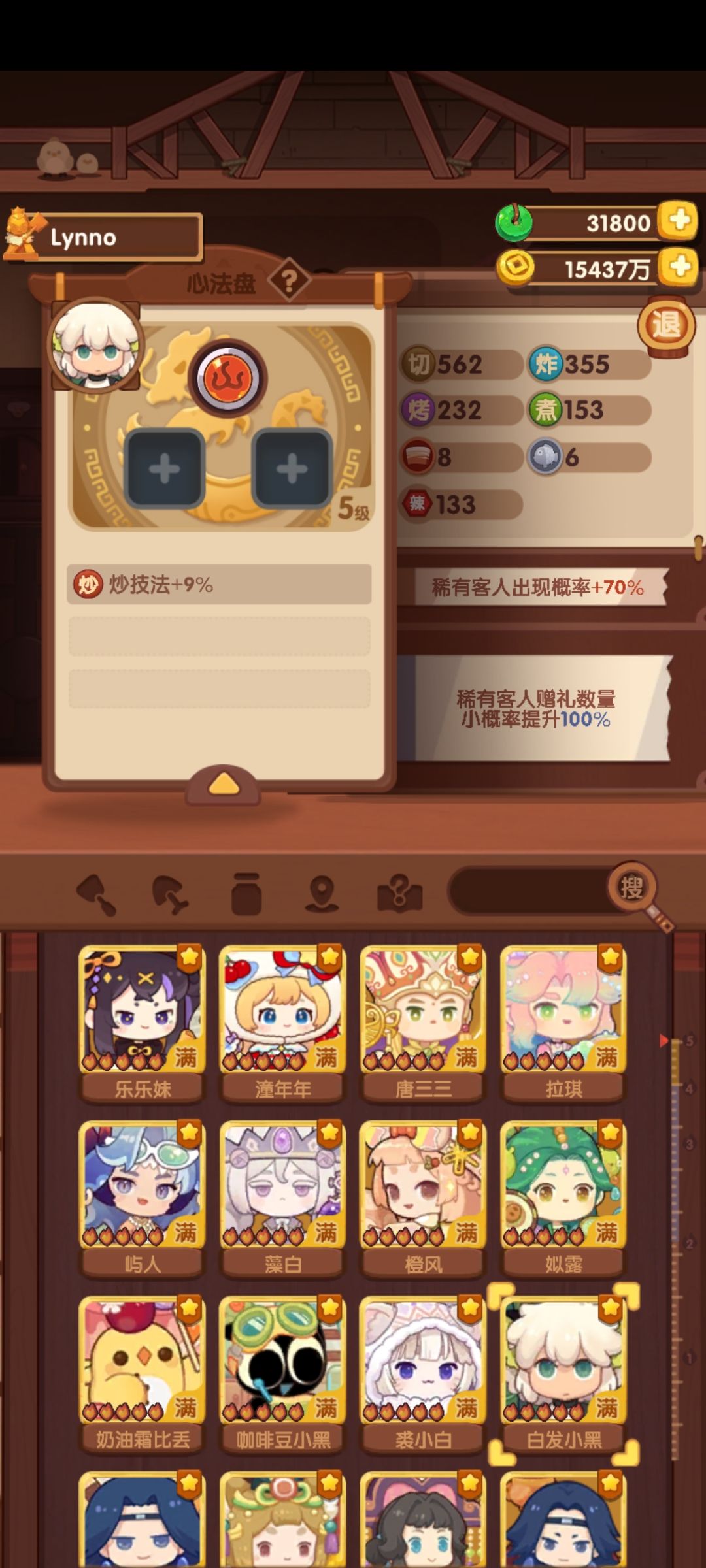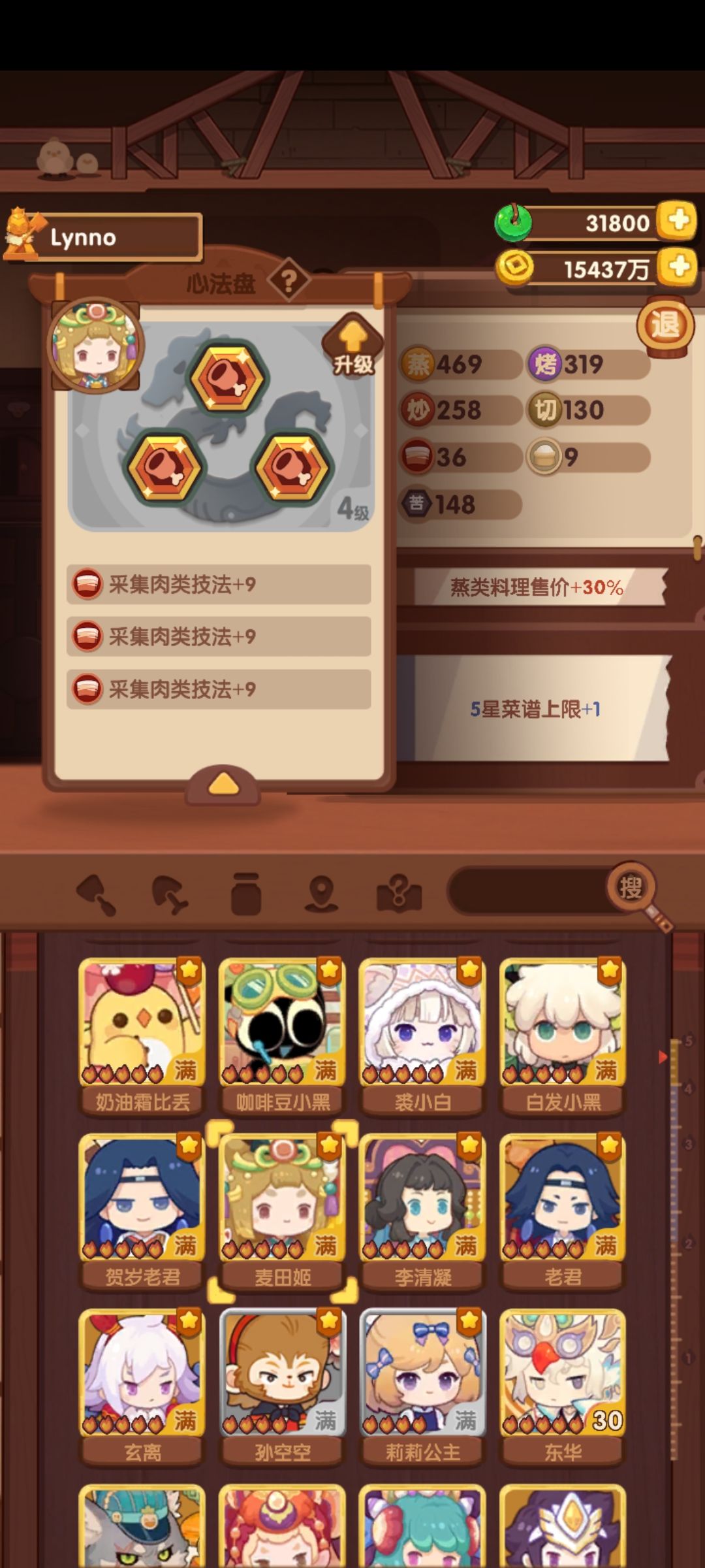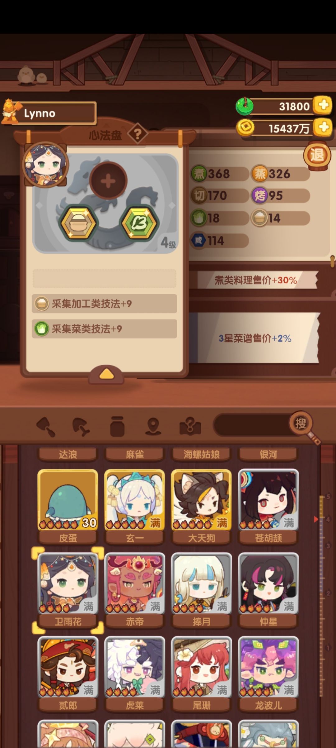 下面两个四级的是采集强神。麦田鸡三个四级肉采+27,雨花两个4级孔+18,麦田鸡还能升1级。其他的就不展示了,主要宴会厨子加上限,挖矿厨子加采集。