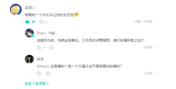 评论区有位勇士提了个“广受好评”的奖励提议,可惜赞没到100,计划中断,希望下次大家能拉拉票,把赞给点上去,小MA已经准备好了!