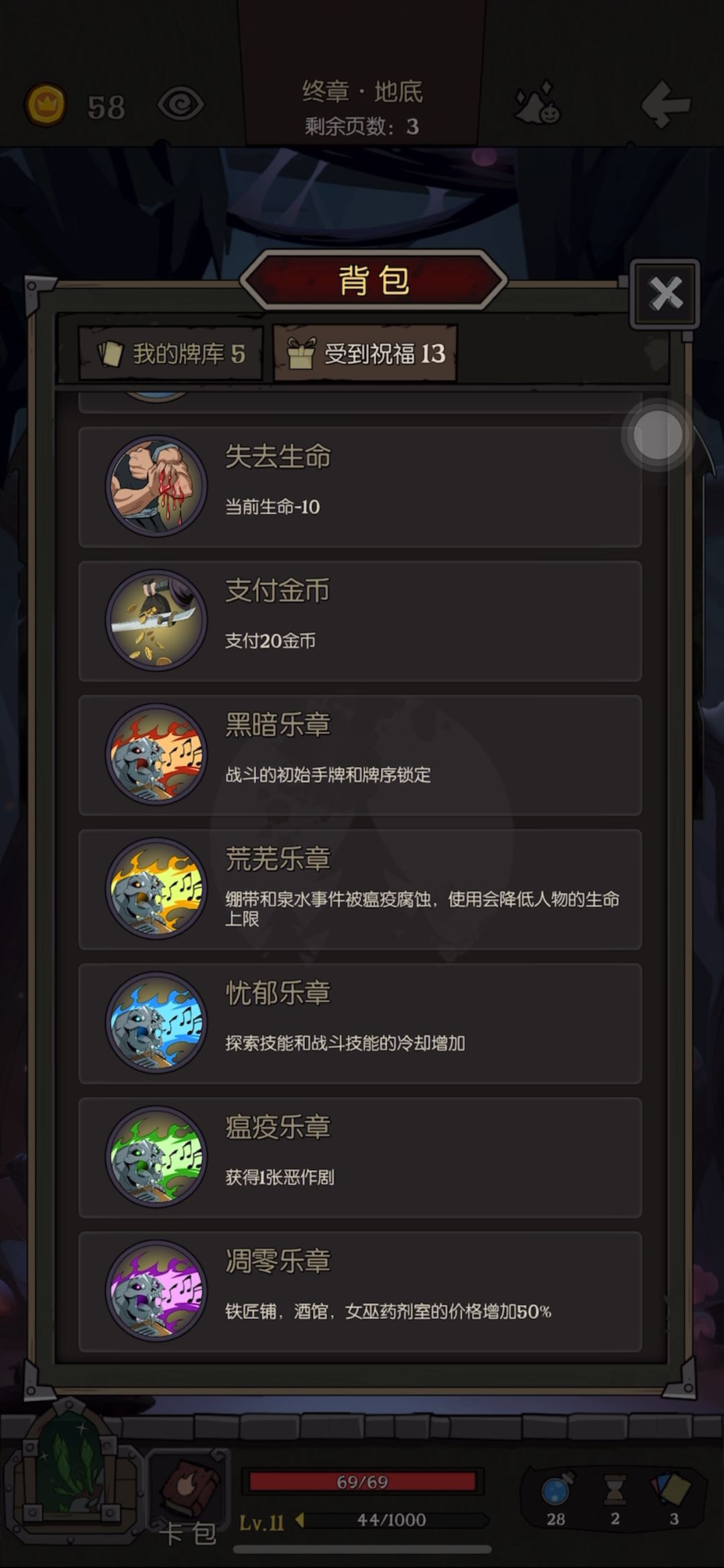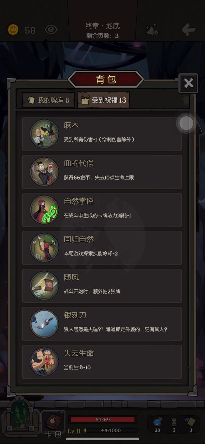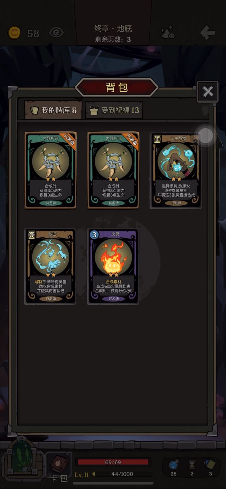 思路:第一章尽量刷到自然掌控+护符,靠技能多删牌;第二章找到三生万物和火灵,补齐缺少的护符,卡组初步形成,剩下的钱多买点蓝;第三章只要删牌和买蓝,在卡组尽量精简的情况下多买蓝,记得存40块要去第四章买放归;第四章,先打蘑菇和穿山甲,攒够钱买放归再打蜗牛,打蜗牛就比较墨迹,有灵刃,剑术训练或者双刃剑的可以打快点。打蘑菇的时候可以下一个护符,让蘑菇先删了护符再刷,蓝不够就开技能,不用省着,打森灵不用技能。打森灵就比较简单,一阶段快打完了记得开放归就行。
