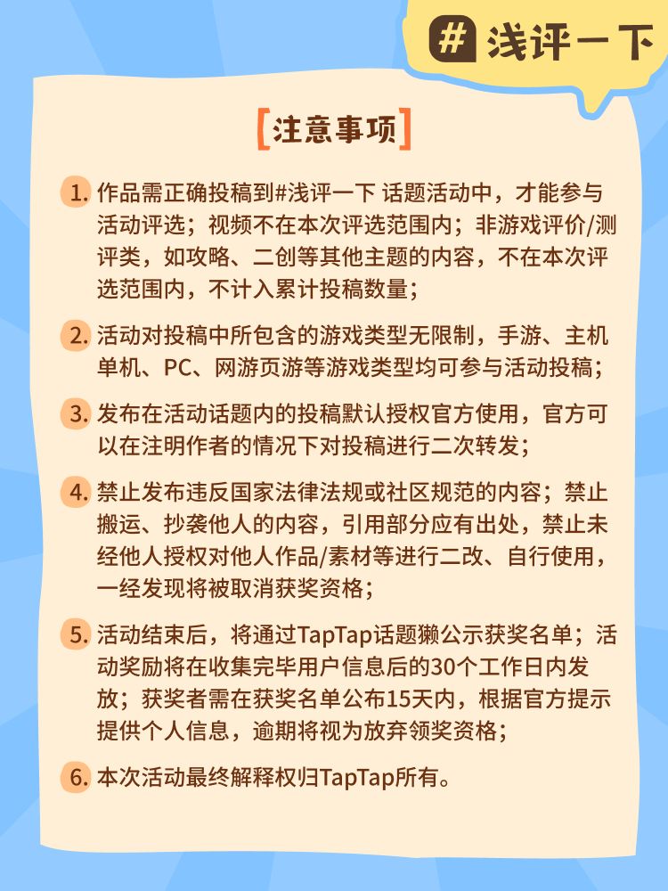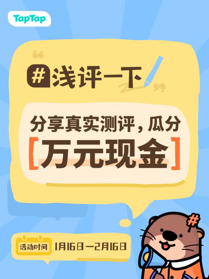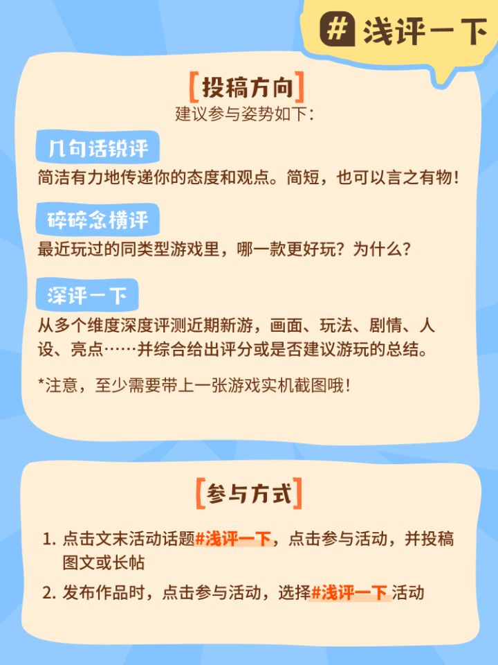 不论褒贬,不局限游戏类型,只要你的评价够真实、够中肯,就有机会在【动态-发现】得到更多曝光!即日起,在活动话题#浅评一下 投稿图文或长帖,即有机会获得流量扶持、瓜分多个现金奖池!